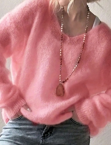 Dame Genser Elegant Mote søt stil Helfarge V-hals Strikket Langermet Vanlige topper Strikke utendørs Hjem Daglig Blå Rosa Høst Vinter