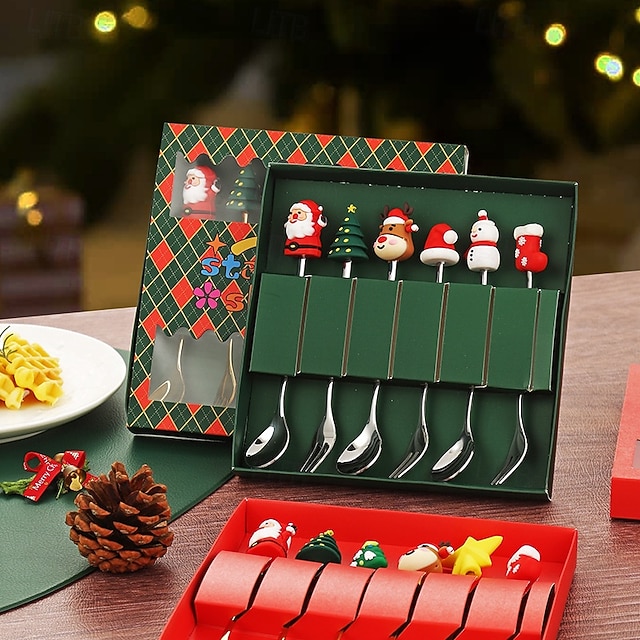 6Pcs Christmas Spoon and Fork Set Stainless Steel Christmas Tree Tea Coffee Dessert Ice Cream Tableware Creative Cutlery Gift for Home Holiday Party#17023052