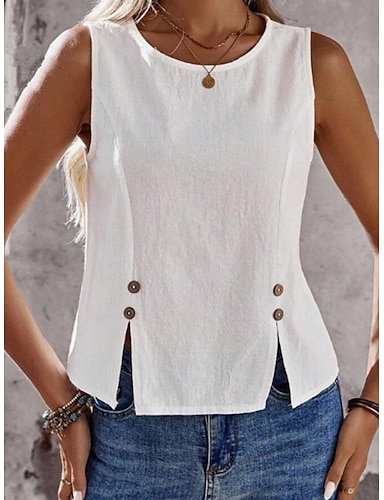 Damskie Koszula Bluzka Sztuczna bawełna len Guziki Jednokolorowe Równina Elegancki Klasyczny Nowoczesny Bez rękawów Krótki rękaw Półgolf Zwykłe topy Codzienny Święto Wyjściowe Niebieski Czarny Biały