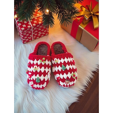 Damskie kapcie świąteczne z dekoracjami przedstawiającymi Świętego Mikołaja i renifery, przytulne pluszowe czerwone kapcie świąteczne na prezent świąteczny i zimowy komfort