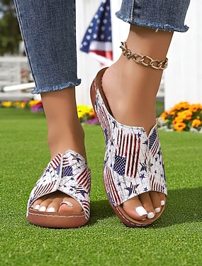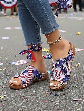 Damskie czerwono-niebieskie sandały na koturnie z nadrukiem flagi USA z okazji 250. rocznicy, patriotyczne i wygodne klapki na lato, idealne na Dzień Niepodległości i przyjęcia świąteczne &odzież