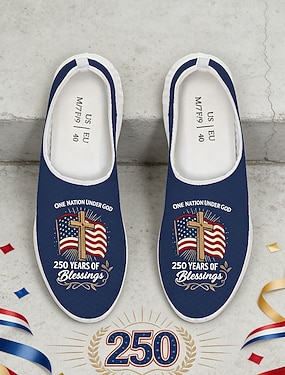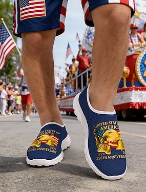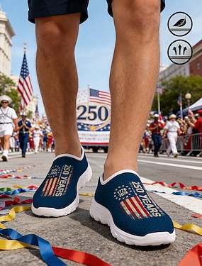 Damskie, niebieskie, patriotyczne, wsuwane trampki – lekkie, oddychające buty do chodzenia z amerykańską flagą i grafiką z okazji 250-lecia, idealne na co dzień, na imprezy świąteczne, w podróż i na