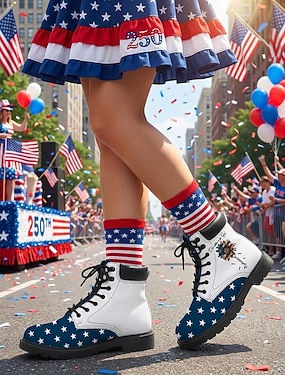 Damskie patriotyczne buty bojowe – wzór w gwiazdy i paski z wyrazistą grafiką na parady, 4 lipca, 250. rocznicę USA i uroczystości na świeżym powietrzu