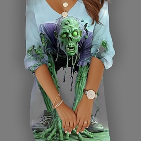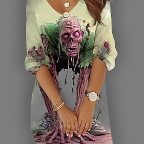 Koszulka damska Czaszki Grafika Casual Śmieszna Krótki Rękaw Serek Okrągły Regularne Top Codzienny Na wyjścia Weekendowy Nadruk Żółty Niebieski Fioletowy Zielony Lato