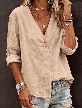 Damskie Bluzka Eleganckie topy Z marszczeniami Niejednolita całość Guziki Równina Elegancja Zabytkowe damska Długi rękaw W serek Zwykłe topy Codzienny Praca Święto Niebieski Rumiany róż Żółtobrązowy