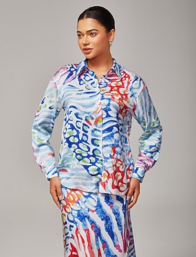 koszula z satyny z guzikami i kołnierzykiem stojącym, artystycznym/retro nadrukiem