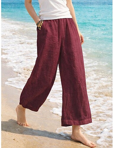 Spodnie damskie z bawełny i lnu plażowe casualowe wakacyjne codzienne długość do kostek średni stan gładkie kieszenie luźne komfortowe oddychające miękkie nieelastyczne casualowy streetwear wakacyjne