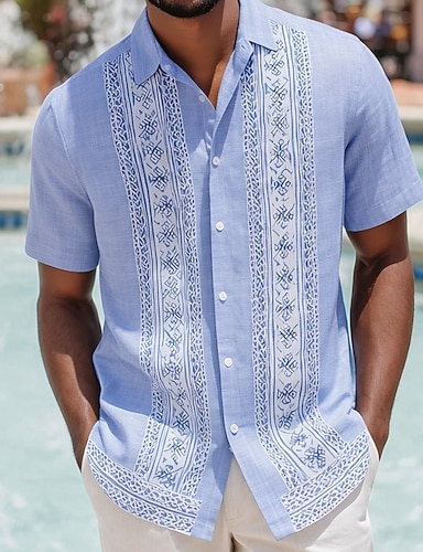 Męskie Boho Geometryczny Prążki Koszula Zapinana na guziki koszula Koszula obozowa Krótki rękaw Moda na co dzień Streetwear Urlop Lato Wiosna Kubański kołnierz Druk 3D Niebieski Żółty Zielony Khaki