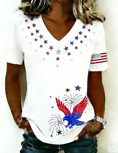 Amerykański Dzień Niepodległości Damskie Podkoszulek Nadruk Graficzny Flaga Lampka wina Elegancki Klasyczny Codzienny Krótki rękaw Półgolf Zwykłe topy Codzienny Niebieski Biały Żółty Czerwony Czarny
