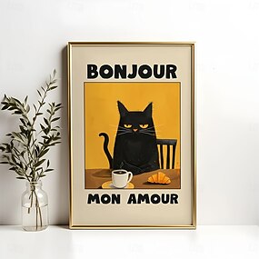 Plakat śniadaniowy z motywem czarnego kota w stylu vintage, 1 szt. - „Bonjour mon amour” bez ramki, do kuchni, jadalni lub sypialni, ilustracja kota w stylu francuskim w ciepłych tonach, sztuka