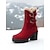 Damskie czerwone zamszowe botki na grubym obcasie z ozdobnym sztucznym futerkiem i klamrą – stylowe, zimowe buty na co dzień, idealne na wyjścia na zewnątrz i święta Bożego Narodzenia