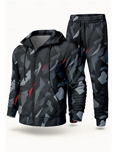 Męskie Bluza z Kapturem Dres Komplet sportowy Ściągana na sznurek Zapiąć na zamek błyskawiczny Geometria Zestawy odzież Jesień Zima Królewski błękit Ciemnoszary Kariera Na zewnątrz Podróże Lekki Moda