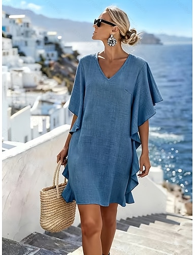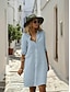 Damskie Sukienka do kolan Sztuczna bawełna len Sukienka koszulowa Codzienne sukienki Sukienka bawełniana Moda Nowoczesny Na zewnątrz Urlop Wyjściowe Regularny Równina Krótki rękaw W serek Niebieski