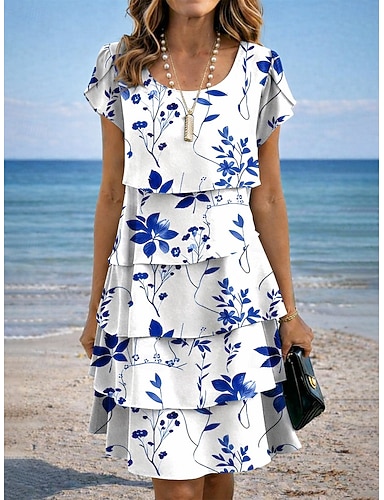 Damskie Sukienka midi Sukienka trapezowa Letnie sukienki Urlop Codzienny Codzienny Regularny Kwiaty Graficzny Krótki rękaw Półgolf Niebieski Biały Rumiany róż Błękit nieba Lato Wiosna