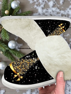 Damskie złote kapcie w kształcie choinki – elegancki wzór złotej choinki, miękka, futrzana wyściółka zapewniająca wygodę, idealne na świąteczny relaks, poranek Bożego Narodzenia i jako prezent zimowy