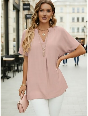 Damskie Podkoszulek Koszulka Falbana Guziki Równina Moda Elegancki Klasyczny Krótki rękaw W serek Zwykłe topy Codzienny Wyjściowe Weekend Niebieski Czarny Biały Rumiany róż Khaki Lato Wiosna
