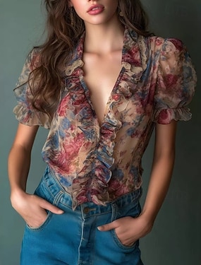 Damskie Koszula Koszula Boho Bluzka Koszula z falbanką Falbana Kwiaty Elegancki Klasyczny Nowoczesny Krótki rękaw W serek Zwykłe topy Codzienny Święto Wyjściowe Rumiany róż Lato Wiosna
