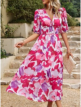 Damskie Sukienka midi Sukienka A line Urlop Codzienny Na zewnątrz Wyjściowe Regularny Kwiaty Krótki rękaw W serek Niebieski Czarny Jasnozielony Czerwony Lato Wiosna