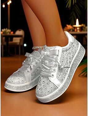 Damskie, błyszczące, sznurowane trampki z kryształkami - efektowne, codzienne buty na imprezę, idealne na wieczorne wyjścia, do klubów i na wieczorne imprezy