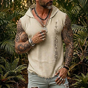 Męska kamizelka wikingów z runami nordyckimi, futhark, pogański wojownik w stylu boho, plemienny, bez rękawów, z kapturem, z grafiką, postrzępionym, surowym brzegiem, luźny krój, letni festiwal