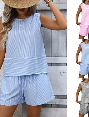 Damskie Zestawy spodenek Bolerko górne Bez rękawów Okrągły dekolt Prążki Ściągana na sznurek Moda Moda miejska Codzienny Na zewnątrz Niebieski Czarny Rumiany róż Lato Regularny