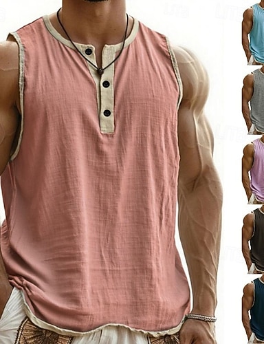 Męskie Koszula Henley Kamizelka Top Podkoszulek lniany Bluzka na ramiączkach Bez rękawów Henley Lato Równina Moda Designerskie Artystyczny Guziki Urlop Codzienny Wyjściowe Czarny Biały Rumiany róż