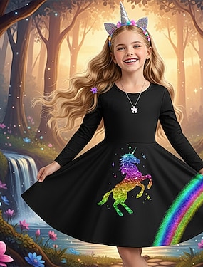Dziewczyny ' 3D Tęczowy Jednorożec Sukienka Długi rękaw Druk 3D Jesień Zima Urlop Sport i turystyka Codzienny Śłodkie Codzienny Piękny Dzieci 3-12 lat Codzienne sukienki Sukienka A line Nad kolano