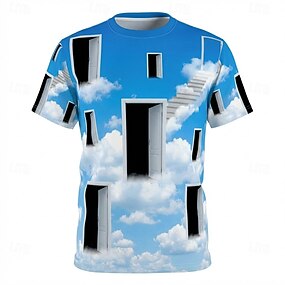 surrealistyczne drzwi na niebie, chmury, schody, dreamcore weirdcore, estetyczny surrealizm, koszulka z krótkim rękawem i okrągłym dekoltem, regularny krój, nadruk na całej powierzchni, swobodny,