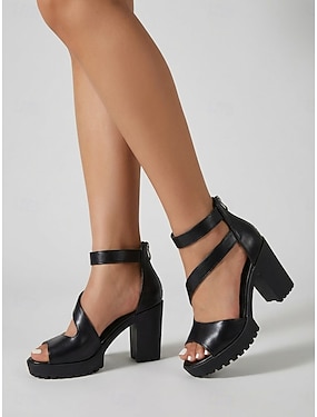 Eleganckie czarne sandały damskie na klockowym obcasie – wygodne, wysokie obcasy na platformie z wycięciem i paskiem na kostkę, idealne do pracy w biurze i na spotkania biznesowe &profesjonalny strój