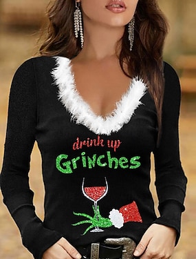 Święta Damskie Bluzka Niejednolita całość Nadruk Graficzny Płatek śniegu Lampka wina Codzienny Długi rękaw W serek Zwykłe topy Codzienny Niebieski Czarny Żółty Jasnozielony Rumiany róż Jesień Zima