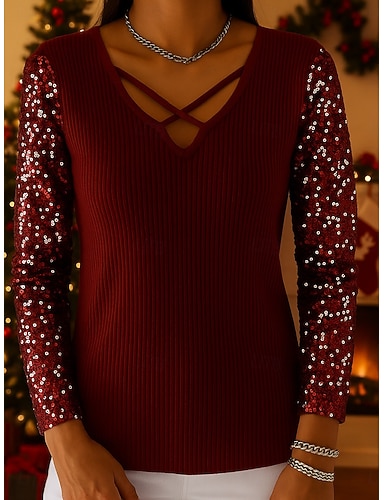 Nowy Rok Damskie Bluzki z cekinami Elegancja Impreza Długi rękaw W serek Zwykłe topy Czarny Wino Wiosna Jesień Zima