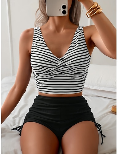 Kobiece bikini 2-częściowy strój kąpielowy z szortami smukły bez pleców na wakacje plażowe ubranie w paski halter bez rękawów