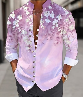 Męskie Kwiaty Koszula Koszula lniana Koszula Aloha Długi rękaw Codzienny Dzienne zużycie Wyjściowe Weekend Wiosna Stójka Nadruk Przycisk w dół Niebieski Fioletowy Zielony
