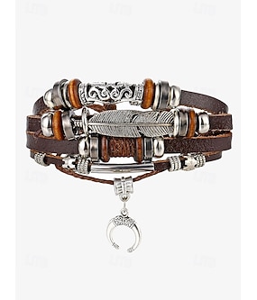 męska boho wielowarstwowa skórzana bransoletka z piórkiem i zawieszką w kształcie półksiężyca – regulowana bransoletka owijana w stylu vintage na co dzień