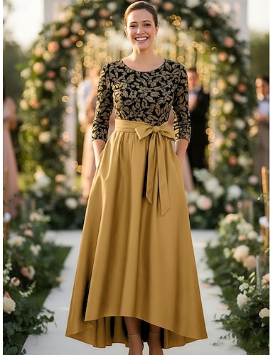 Krój A Asymetryczna Satynowa sukienka Haft koralikowy Sukienka na imprezę Sukienka dla matki panny młodej Rękaw 3/4 Półgolf Elegancja Formalny Święto Pół formalne Satyna z Kokardki