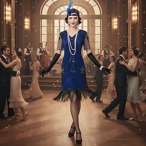 Zabytkowe Ryczące 20s 1920 roku Do kolan Sukienka w stylu lat 20-tych Rękawiczki Nakrycie głowy Krótkie rękawy Wielki Gatsby Czarleston Cekiny Frędzel Strój na bal maskowy Damskie Halloween Karnawał