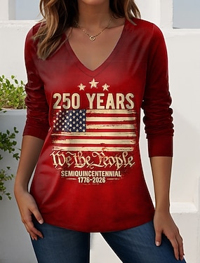 Koszulka patriotyczna dla kobiet na Dzień Niepodległości dekolt w serek długi rękaw tunika geometryczna narodowa flaga elegancka vintage stylowa regularne bluzki codziennie weekendowo nadruk czerwony