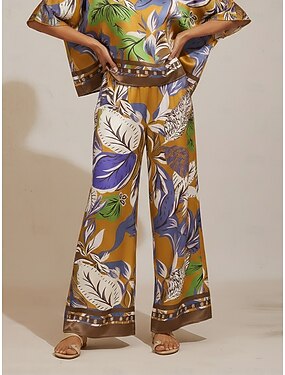 Dzikie satynowe spodnie z szerokimi nogawkami w kształcie hibiskusa