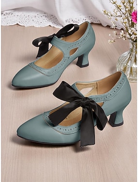 Kobiece edwardiańskie vintage Gatsby obcasy wstążkowe - fioletowe buty Mary Jane w stylu z lat 1900 z czarną kokardą wyciętym wzorem i zakrzywionymi średnimi obcasami do historycznego cosplayu retro
