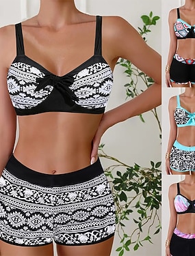 Strój kąpielowy bikini dla kobiet 2 częściowy szorty palmowe bez pleców slim wakacyjny plażowy kwiatowy top na szyję bez rękawów