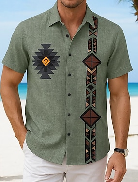 Męskie Koszula lniana Letnia koszula Stroje plażowe Zapinana na guziki koszula Geometryczny Urlop Codzienny Zielony Krótki rękaw Wieczorne Lato Wiosna Odzież