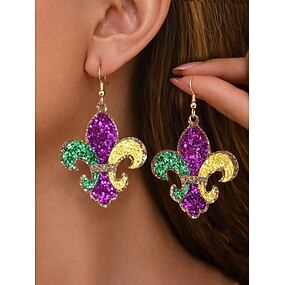Damskie kolczyki z eko skóry w trzech kolorach z motywem fleur-de-lis na karnawał, w żywych kolorach fioletu, zieleni i żółci, lśniący wzór, idealne na uroczystości karnawałowe