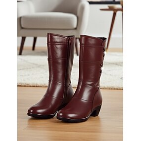 Damskie brązowe buty do połowy łydki na niskim, blokowym obcasie i z zamkiem błyskawicznym z boku, wygodne, skórzane, codzienne, modne buty do noszenia na co dzień, do pracy &stroje jesienno-zimowe