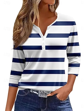 Damskie Podkoszulek Koszulka Nadruk Prążki Moda Elegancki Klasyczny Krótki rękaw W serek Zwykłe topy Codzienny Wyjściowe Weekend Niebieski Lato Wiosna