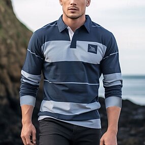 Męskie Kolorowy blok Pasek Koszulki polo do rugby Długi rękaw Koszulki polo Klapa Klasyczny Moda Wzór 3D Nowoczesny Biznes Codzienny Sport Pasek Jesień Zima Granatowy