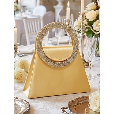 Damska satynowa torebka wieczorowa z okrągłym uchwytem wysadzanym kryształkami, dostępna w wielu kolorach, z łańcuszkowym paskiem do noszenia na ramieniu, idealna na wesela i przyjęcia