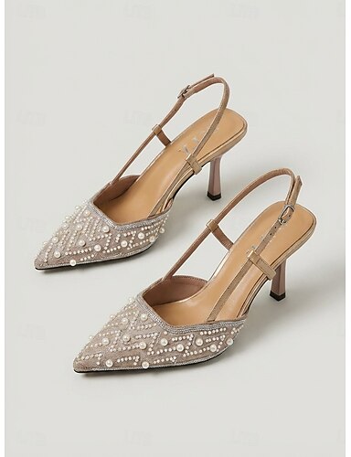 damskie czółenka na obcasie typu slingback w kolorze nude – szpilki z perłowymi zdobieniami i spiczastym noskiem dla gości weselnych w ogrodzie &eleganckie letnie wydarzenia