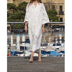 Damskie Sukienka midi Koronkowa sukienka Sukienka letnia Biała sukienka Nowoczesny Plaża Urlop Wyjściowe Luźna Kwiaty Równina Długi rękaw W serek Biały Lato Wiosna Jesień