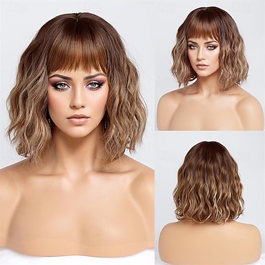 Brązowa Krótka Bob Peruka Impreza - Syntetyczne Włosy dla Kobiet Dziewczyn Kostium Cosplay Karnawał Urodziny Boże Narodzenie Wieczór Panieński Flapper Grzywka Peruka Włosy na Halloween