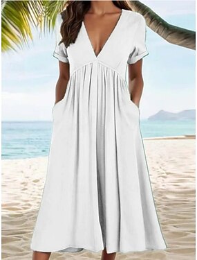 Damskie Sukienka midi Sztuczna bawełna len Codzienne sukienki Elegancja Moda Nowoczesny Na zewnątrz Urlop Wyjściowe Luźna Równina Krótki rękaw W serek Niebieski Biały Zielony Szary Lato Wiosna